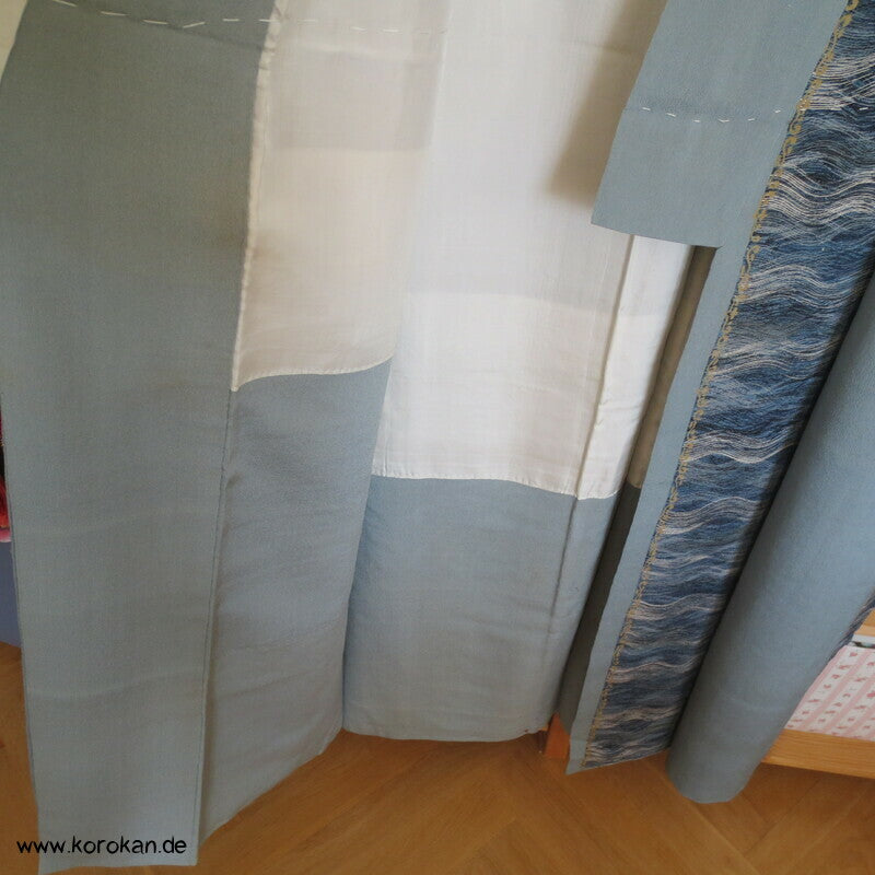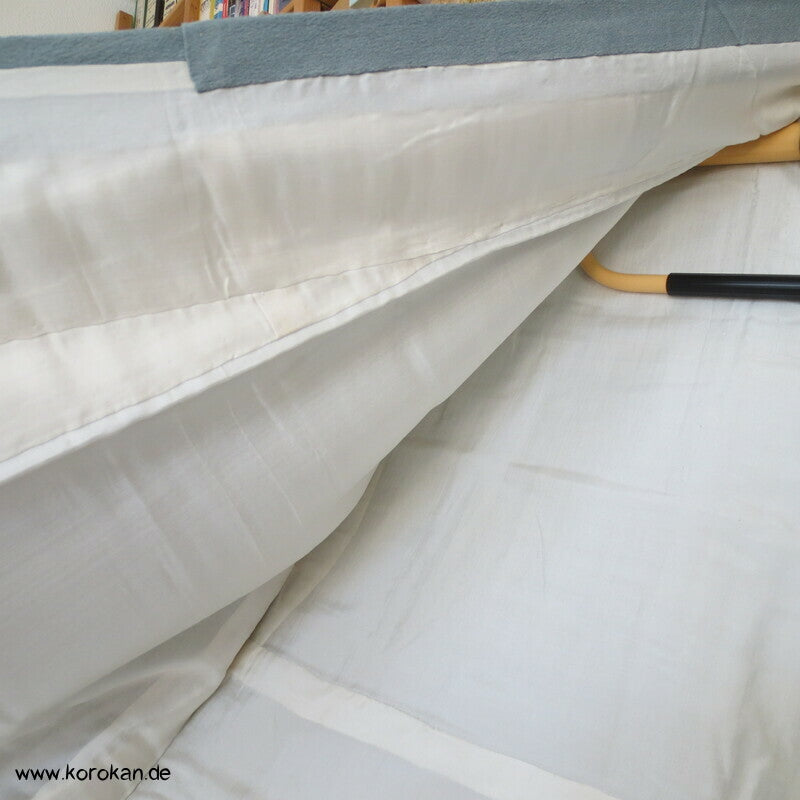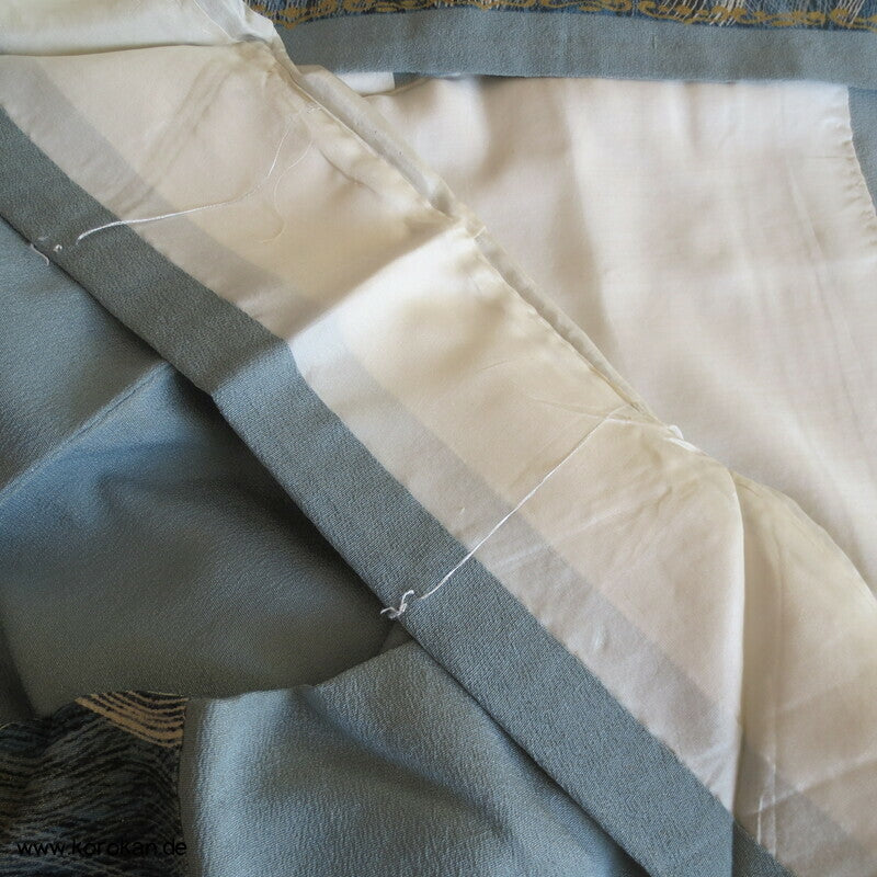 Vintage Homongi Kimono blaugrauer Seidencrepe, bemalt mit Wellenstreifen, sehr Senkrechte betont, feinem oberen hellen Seidenfutter und unterem Hakkake Seidenfutter in grau.