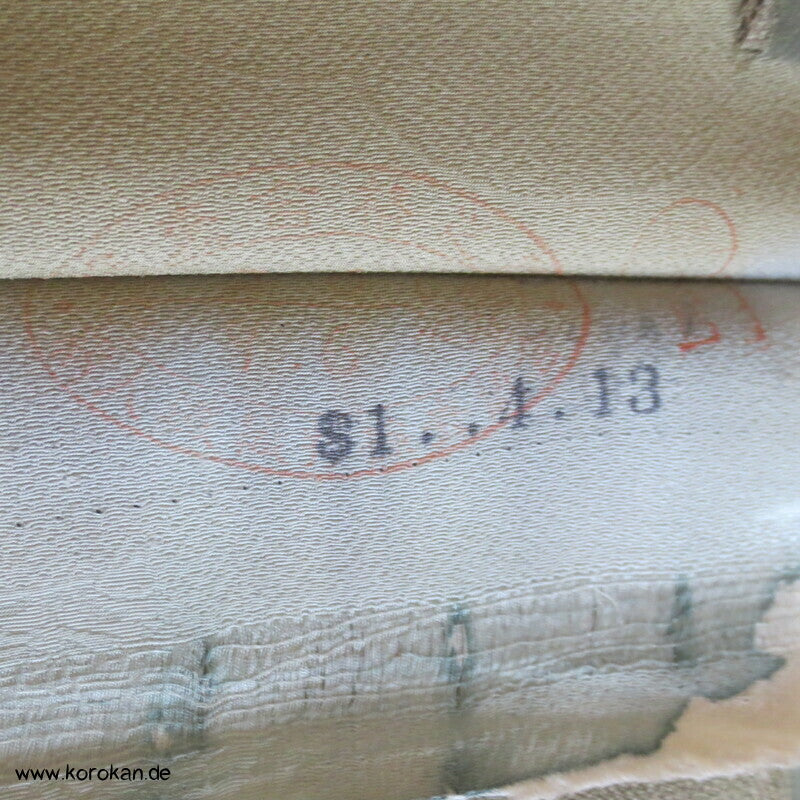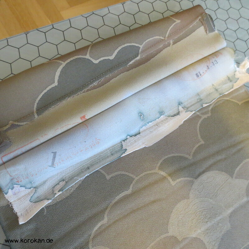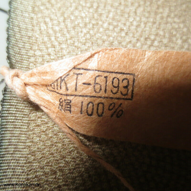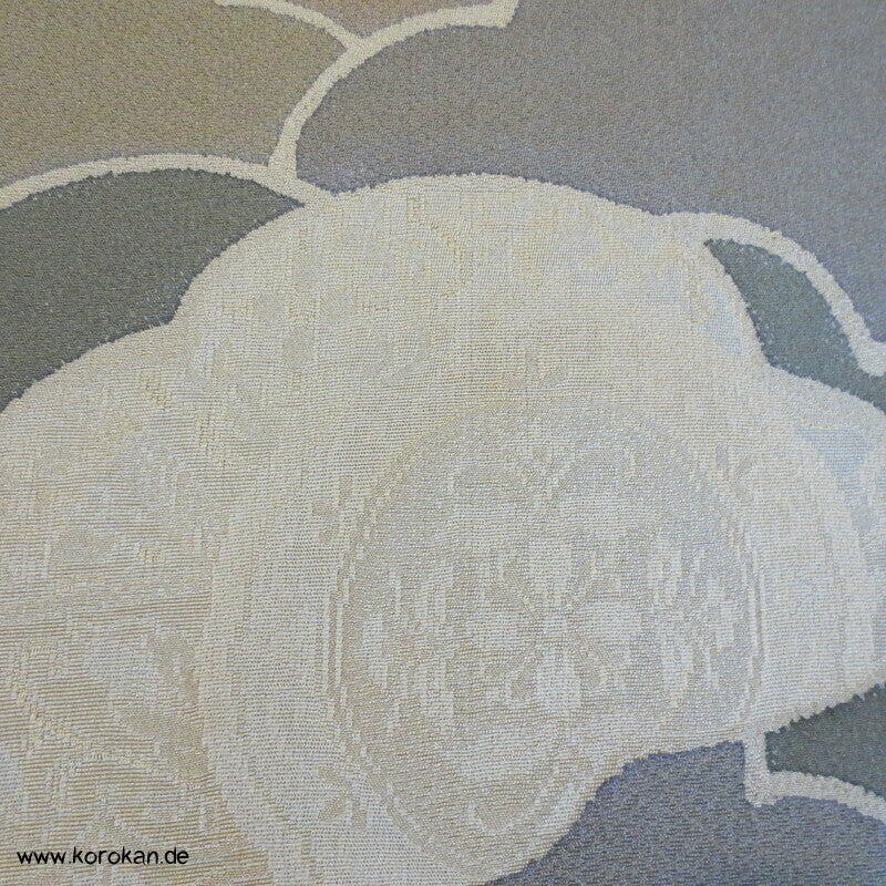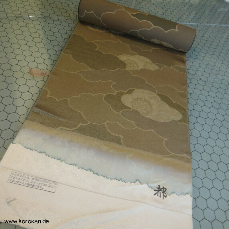 Vintage unbenutzter Kimono Seidendamast natur Basis gewebte Spiegel und Blüten mit Edo Komon Musterwolken.