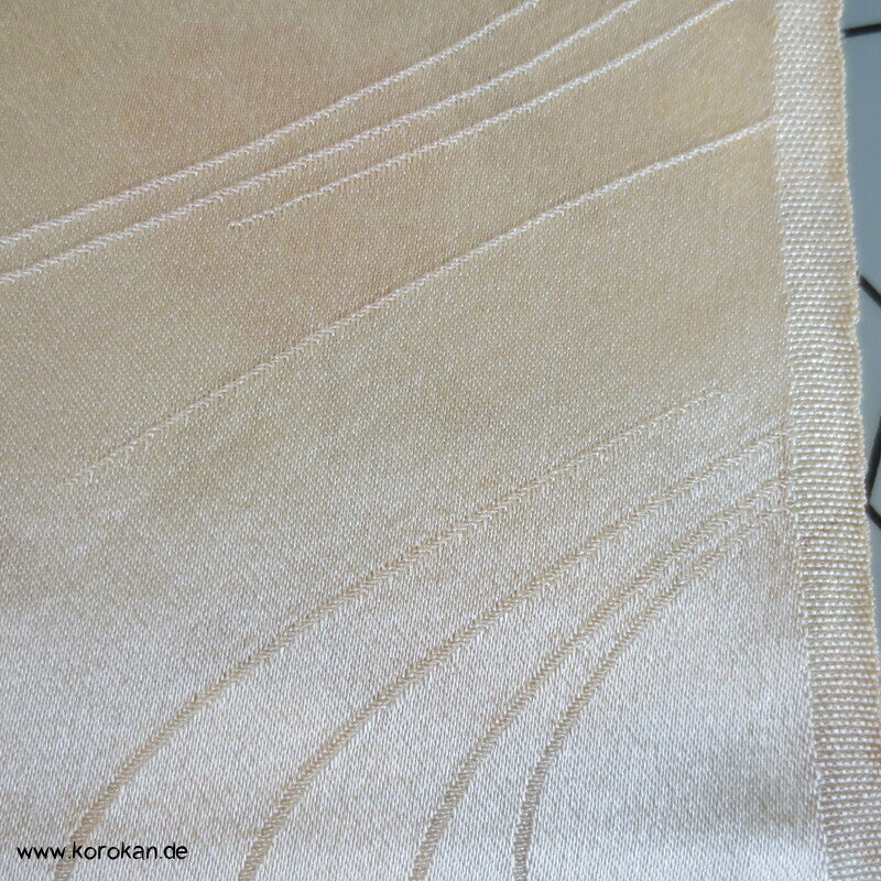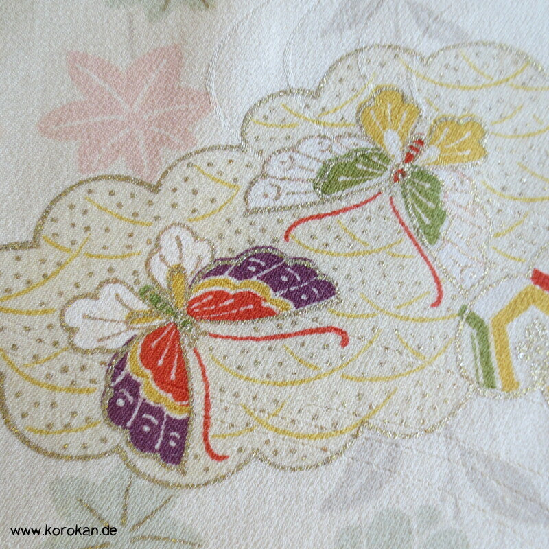 Vintage unbenutzter Kimono Seidendamast natur Basis mit Musterwolken und Schmetterlingen mit Golddruck.
