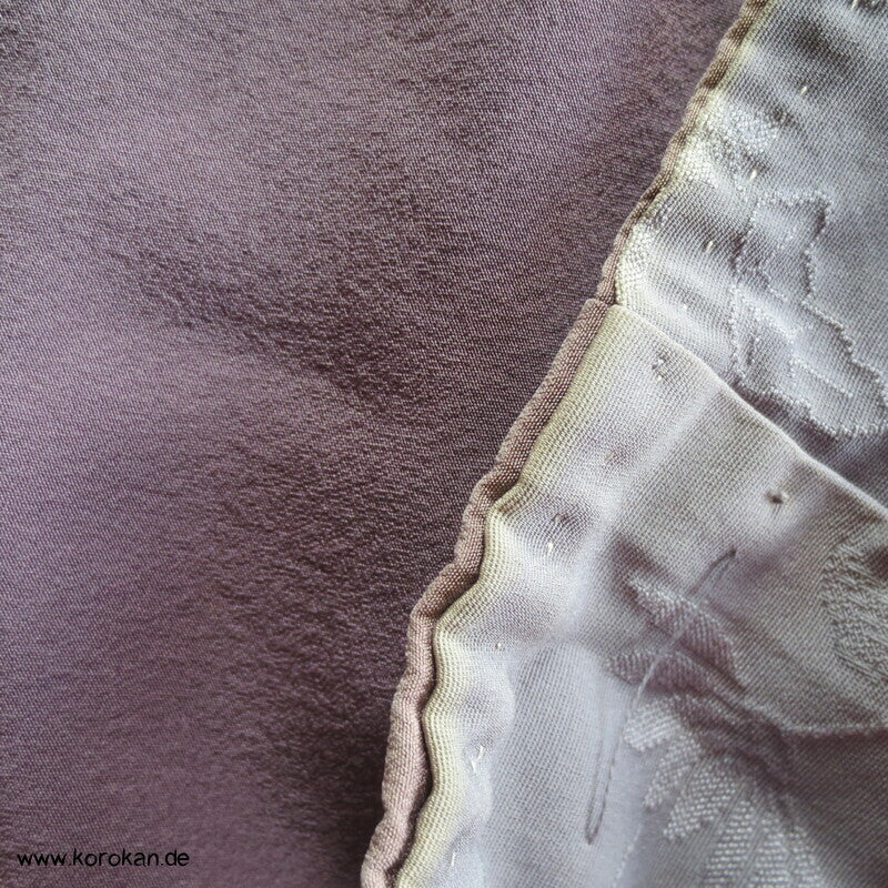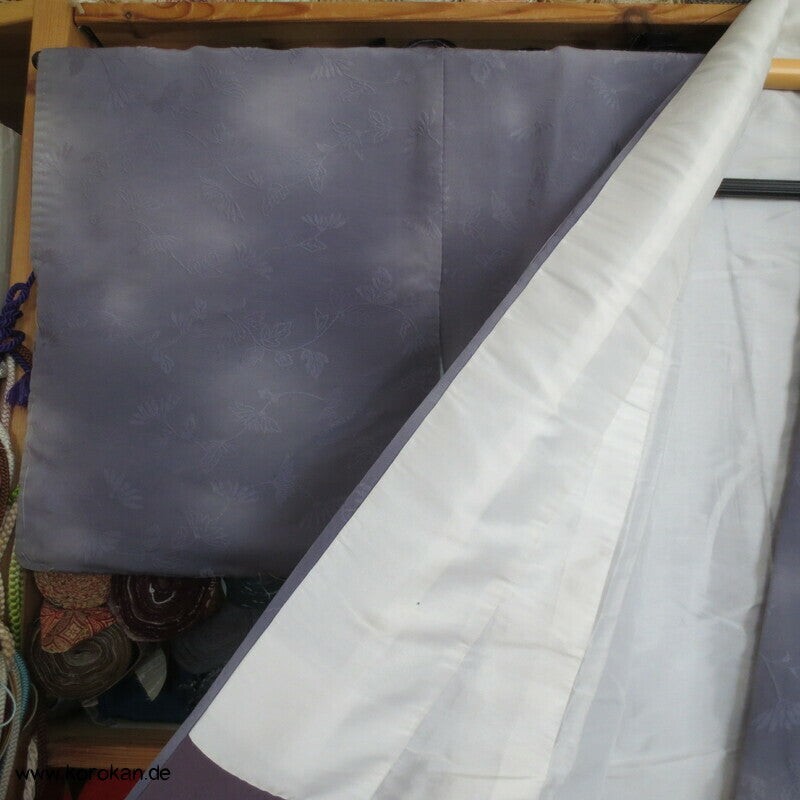 Vintage Seidendamast Iromuji Kimono wolkiger Chrysanthemen Webmuster, hellem oberen Seidenfutter, unterem Seiden Hakkake dunkelmauve Seidencrepe.