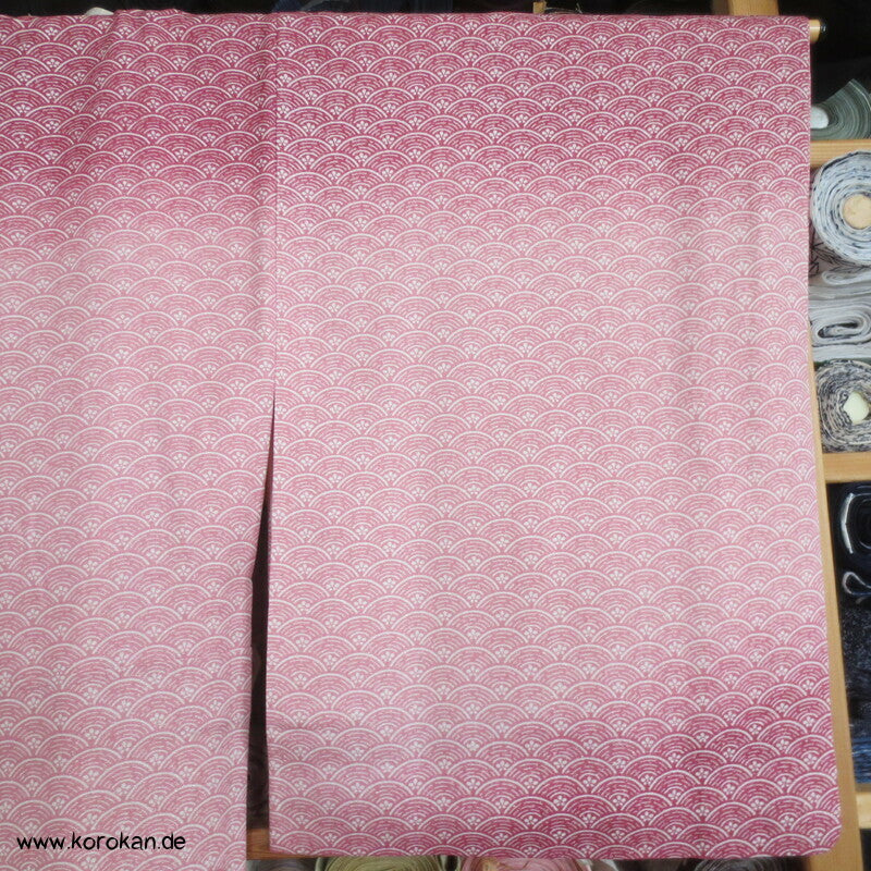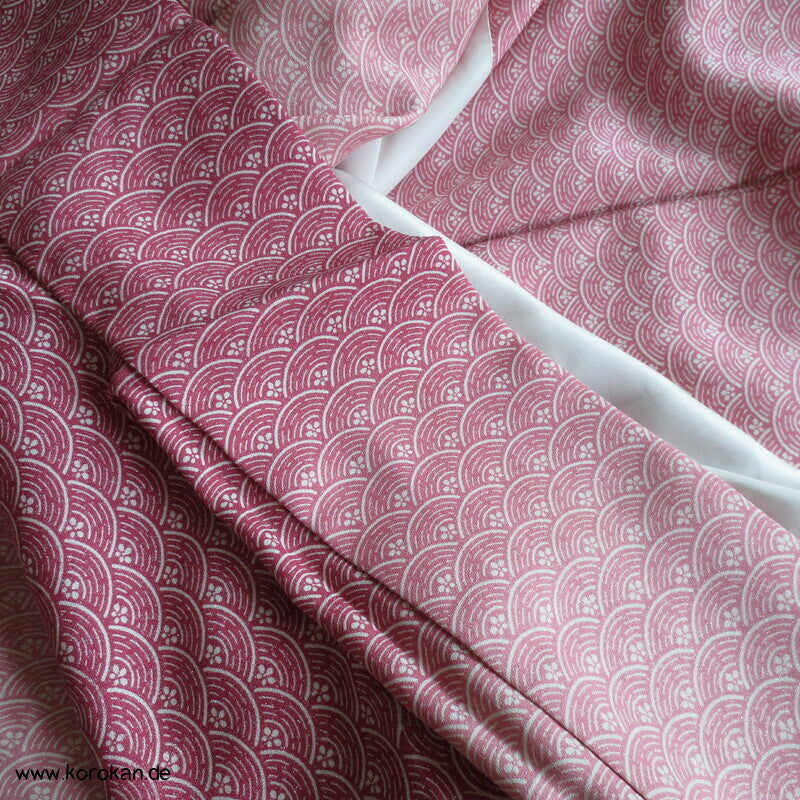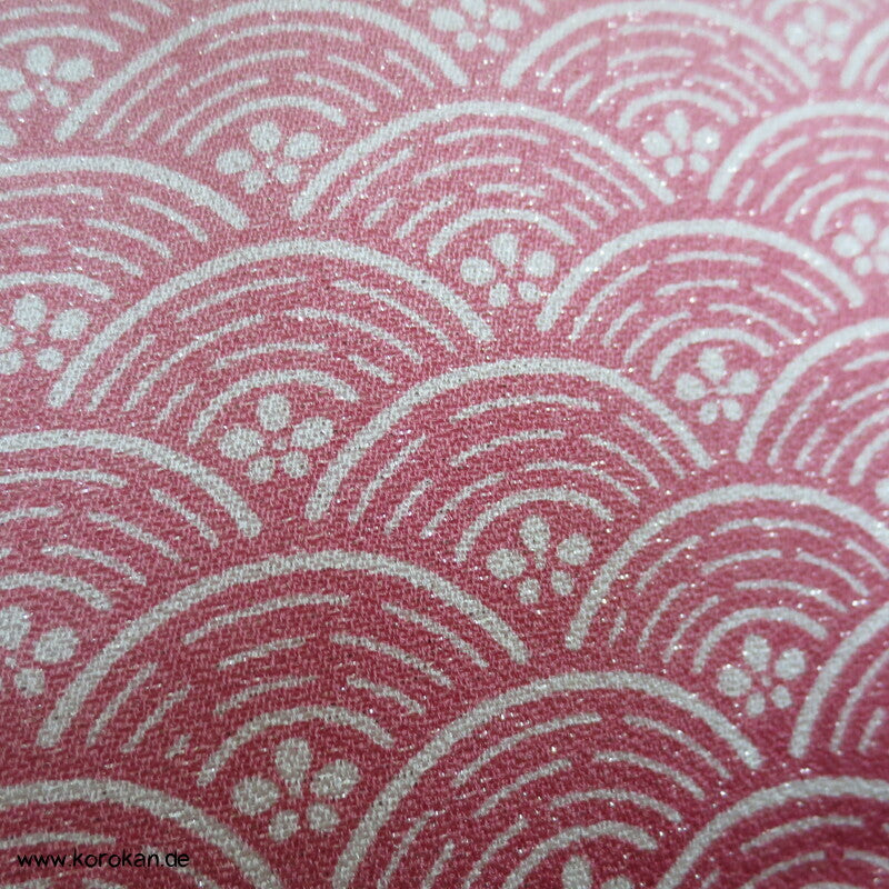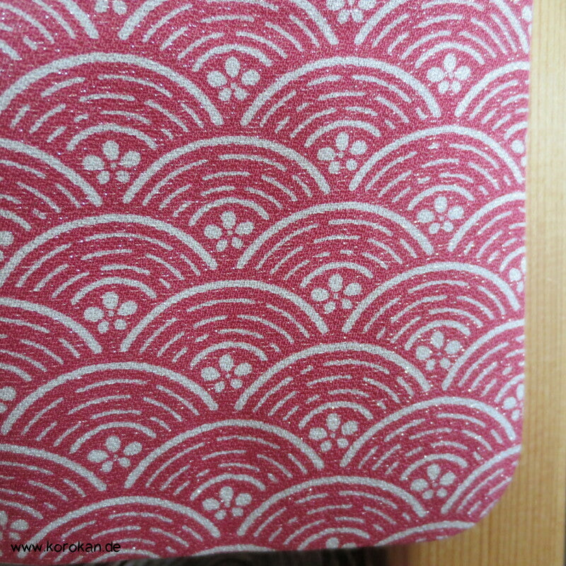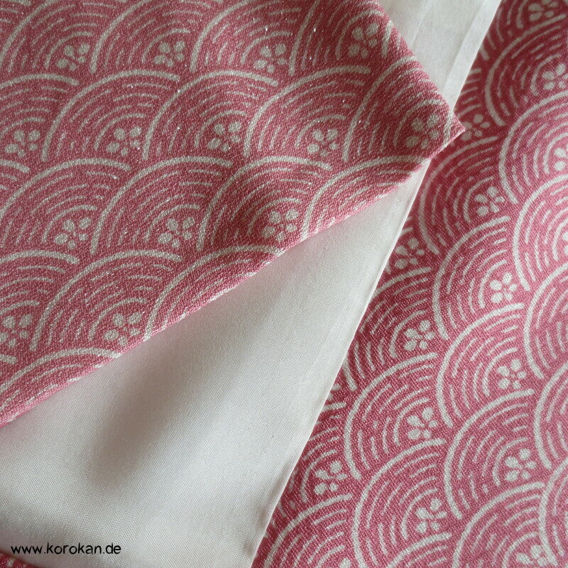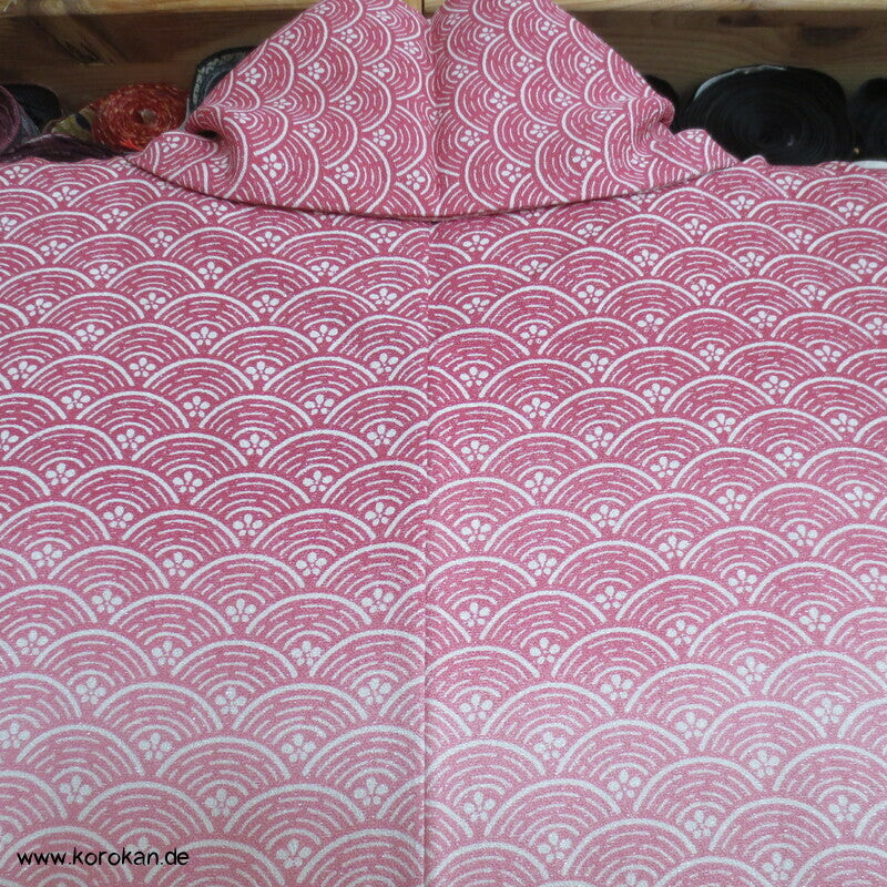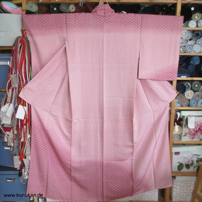 japanischer Vintage Yamato Homongi Kimono Segaiha Wellen / Muscheln im Farbverlauf von aussen nach innen auf einem mit ganz wenig silbernem Lurex durchwebten Seidendamast, feinem oberen hellen Seidenfutter und unterem Hakkake im Oberstoffmotiv aber ohne Lurexbeimischung