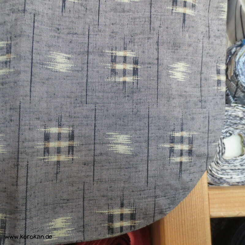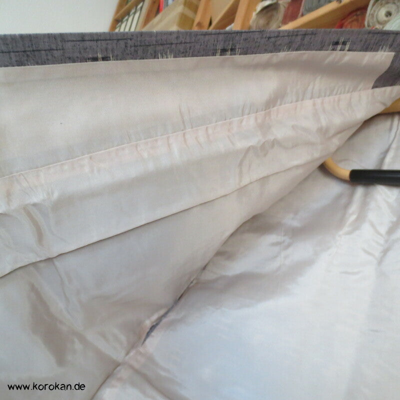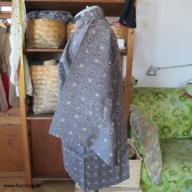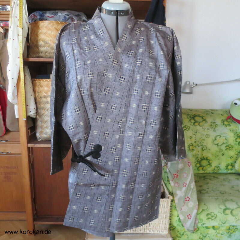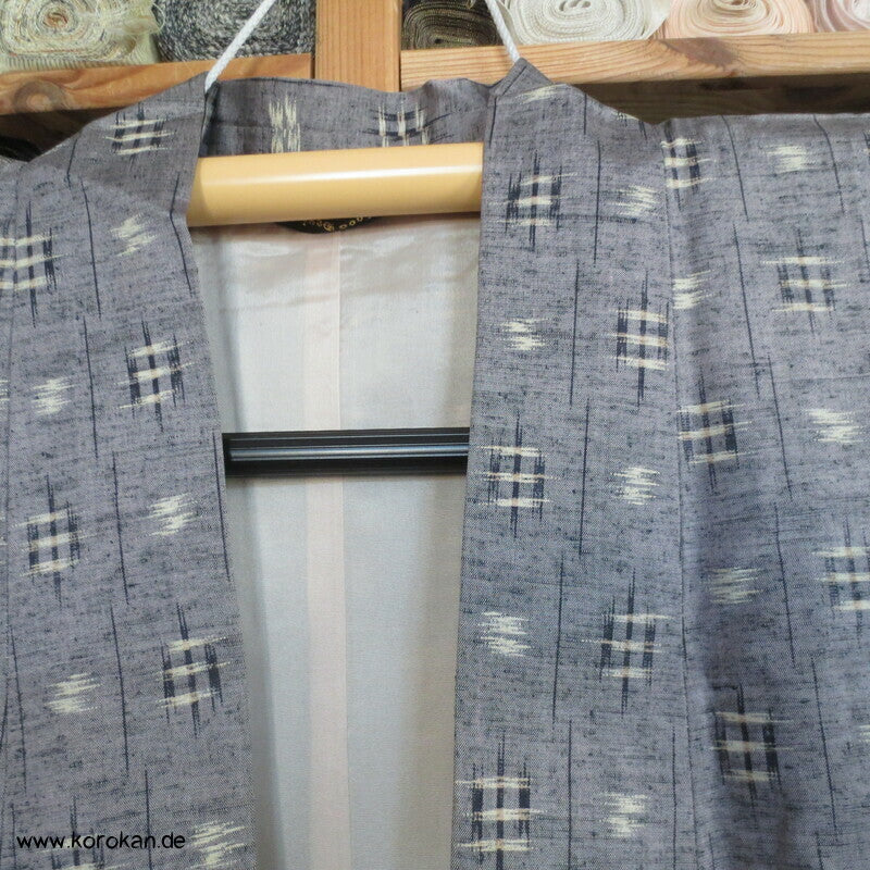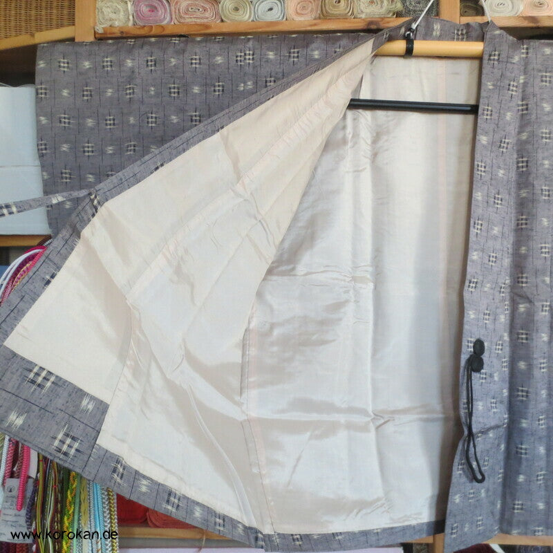 Vintage Dochugi Kimono Jacke aus Tsumugi Seide mit Kasuri Igeta Symbolen, hellblaugrau und natur - mit oberem Acetat Kunstseidenfutter hell.