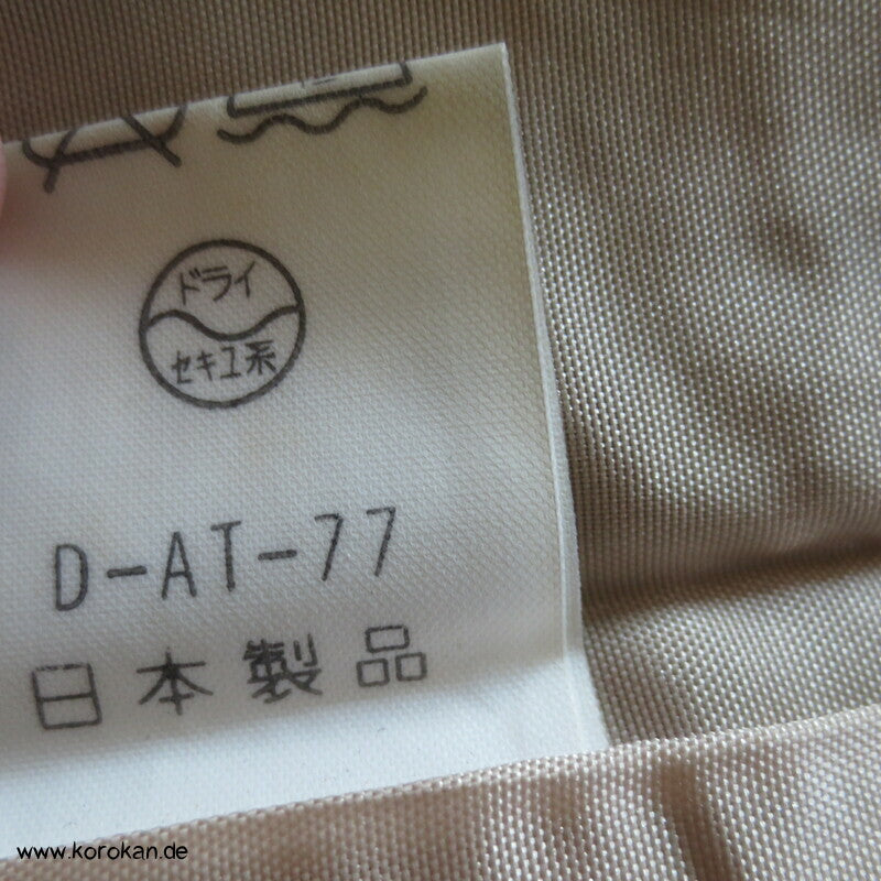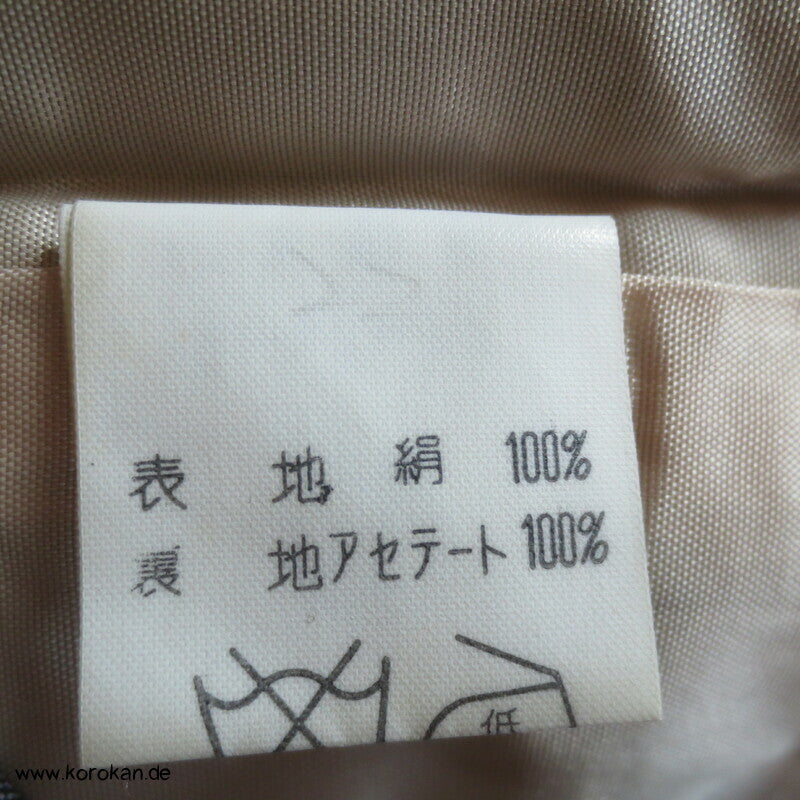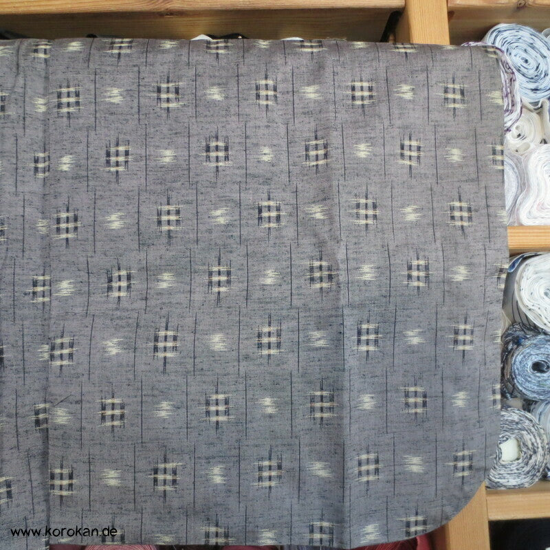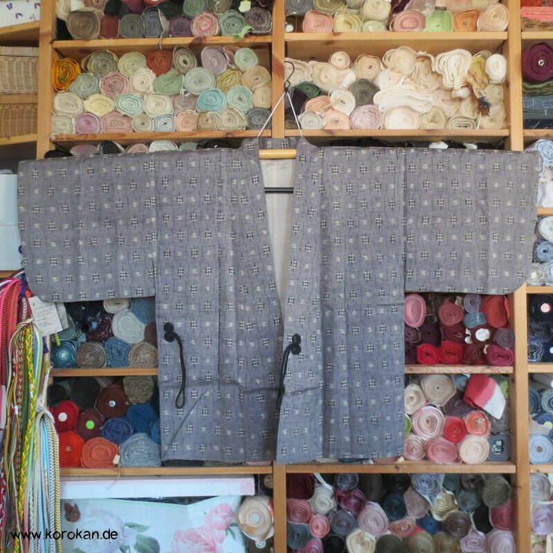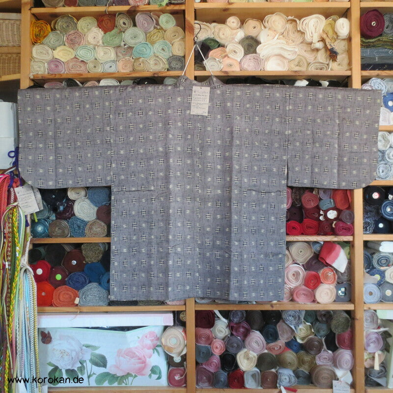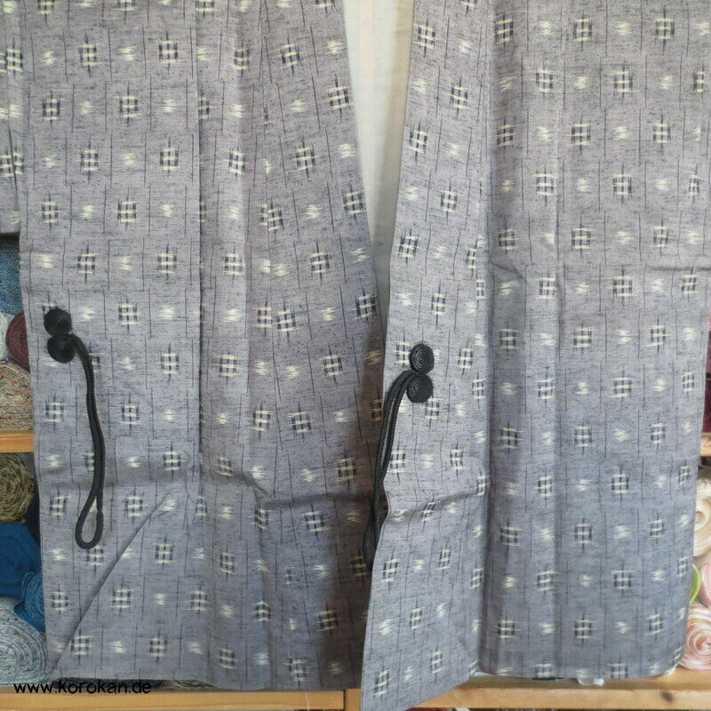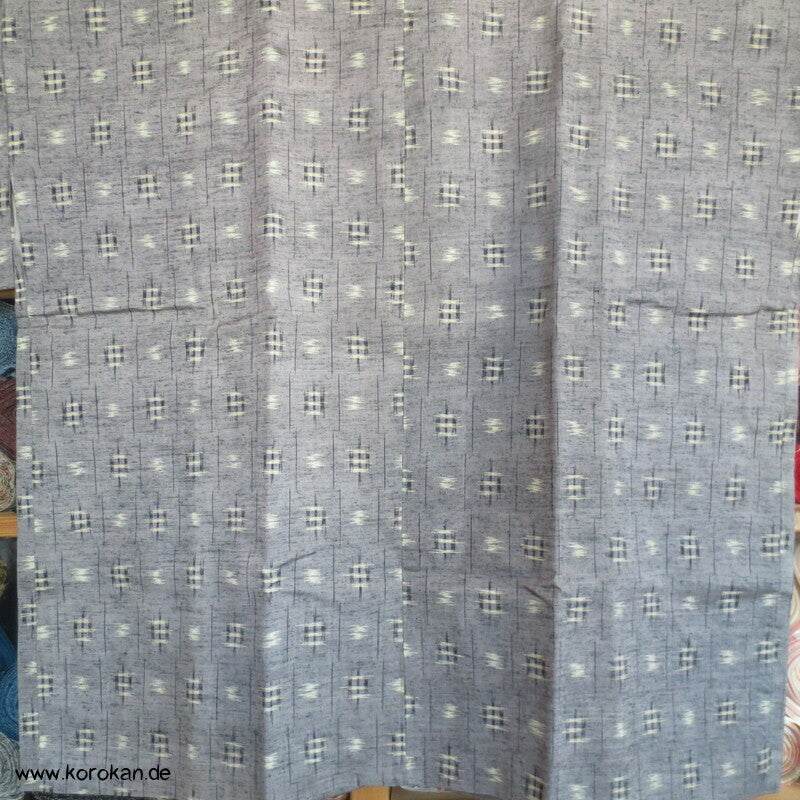 Vintage Dochugi Kimono Jacke aus Tsumugi Seide mit Kasuri Igeta Symbolen, hellblaugrau und natur - mit oberem Acetat Kunstseidenfutter hell.