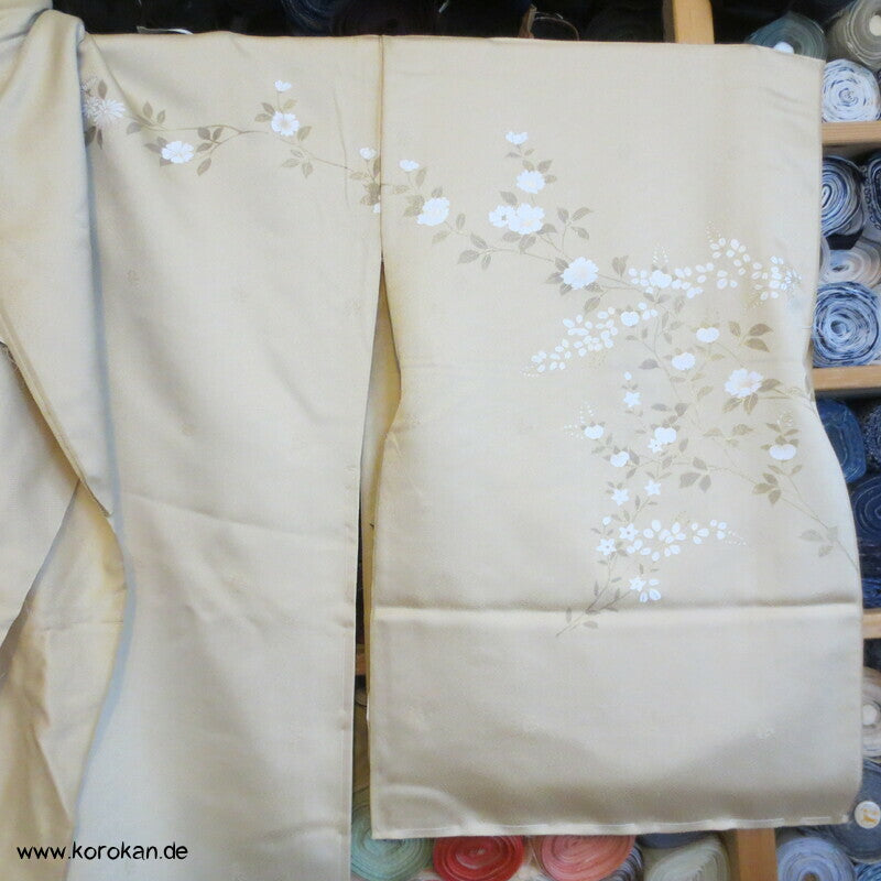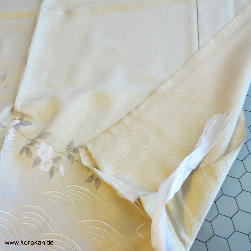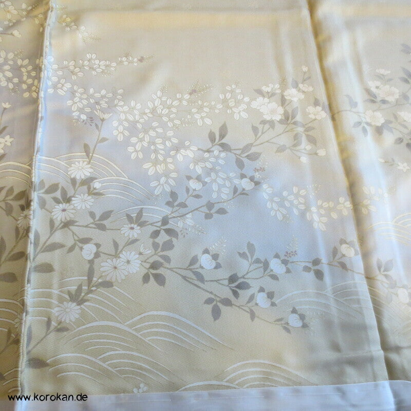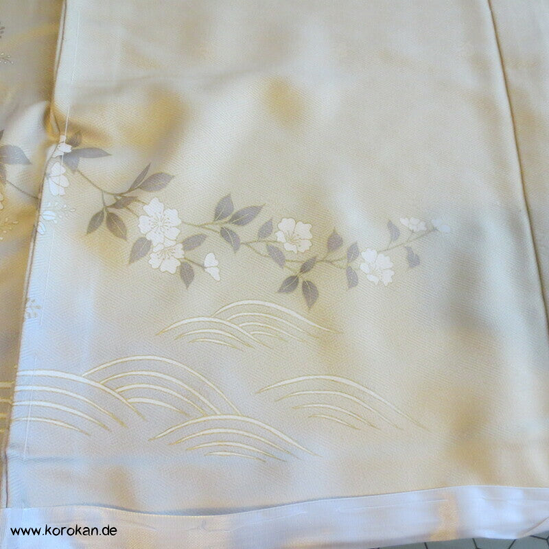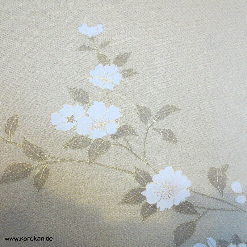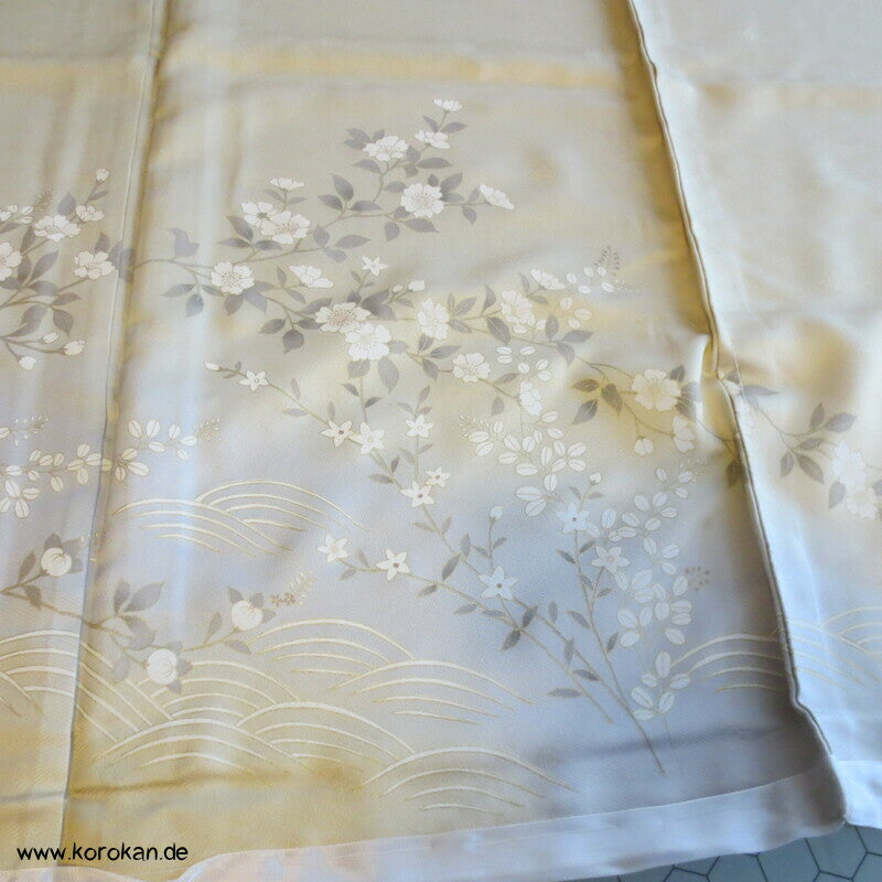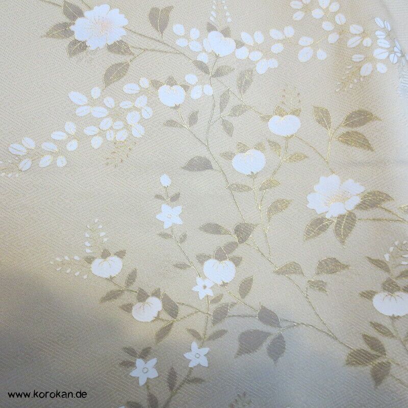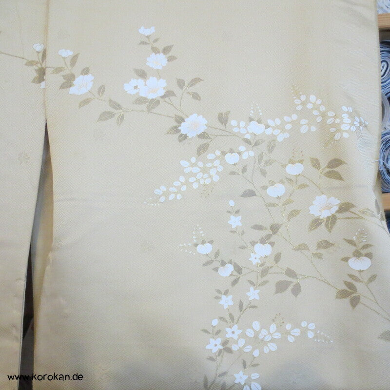 Vintage unbenutzter Karieba Homongi Kimono Stoff in Stücken, Kamelienzweige auf hellbeigen Sayagata Seidendamast, zugeschnitten, nicht genäht. Neuer Stoff