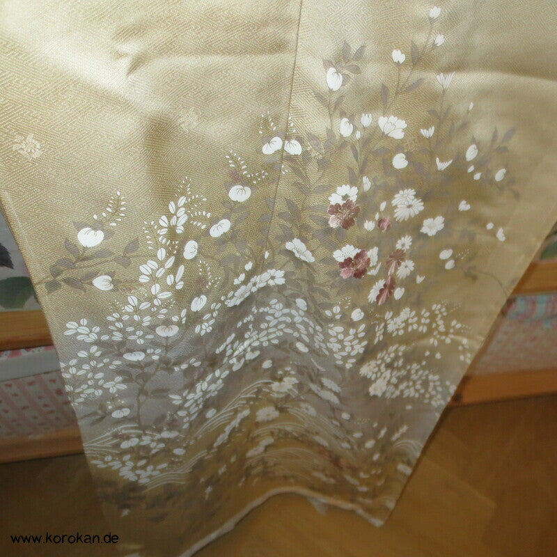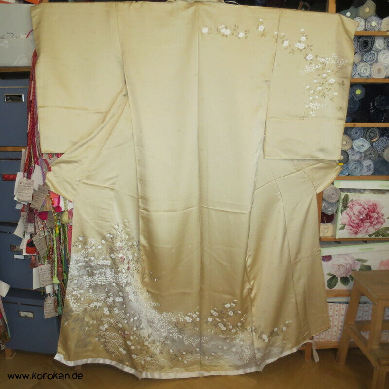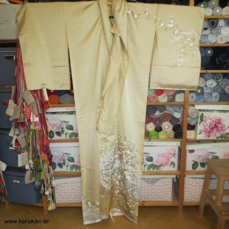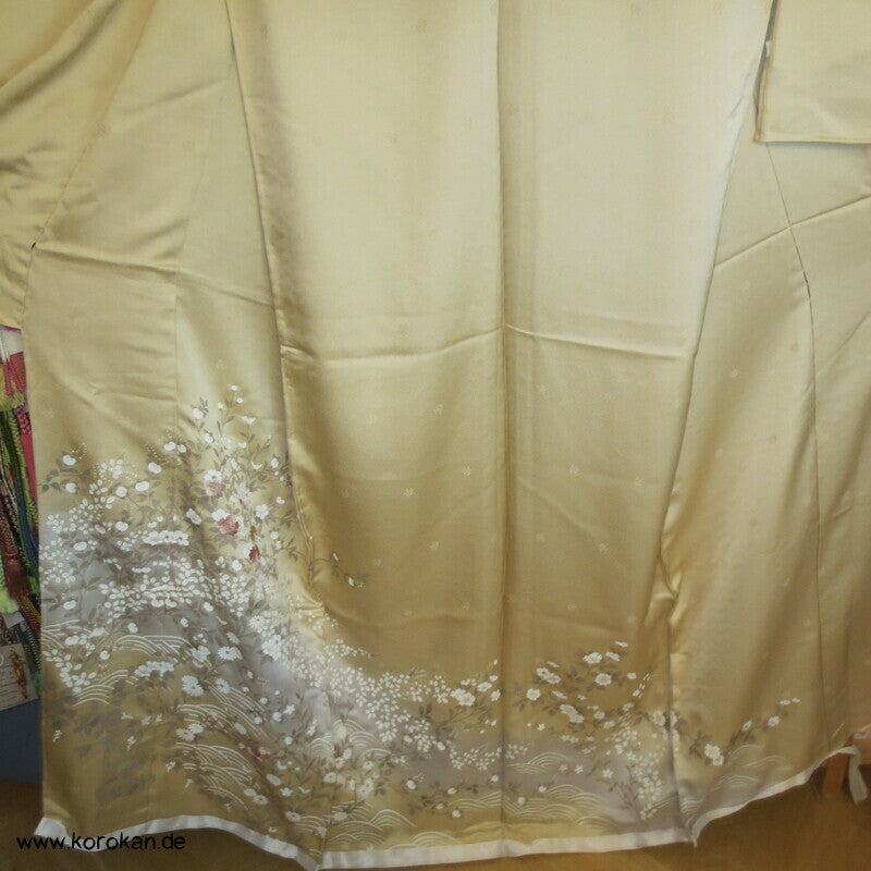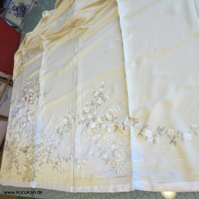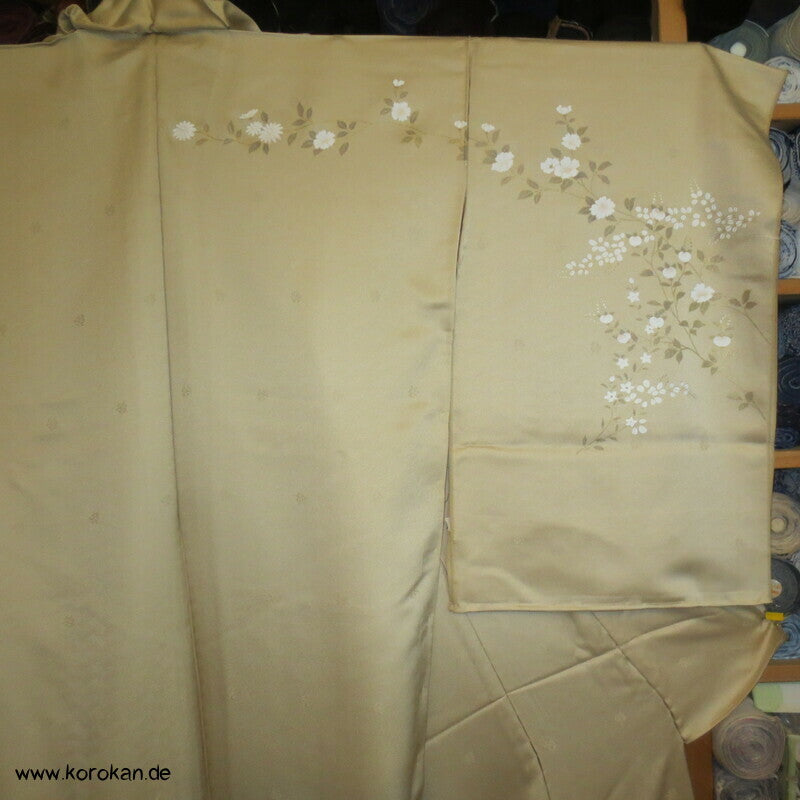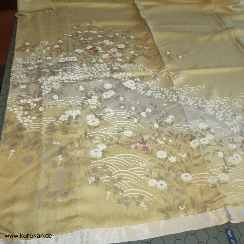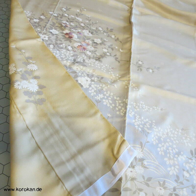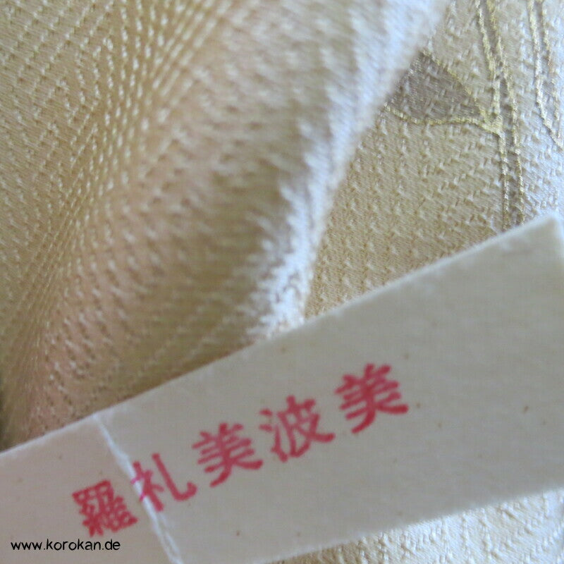 Vintage unbenutzter Karieba Homongi Kimono Stoff in Stücken, Kamelienzweige auf hellbeigen Sayagata Seidendamast, zugeschnitten, nicht genäht. Neuer Stoff