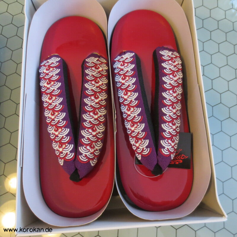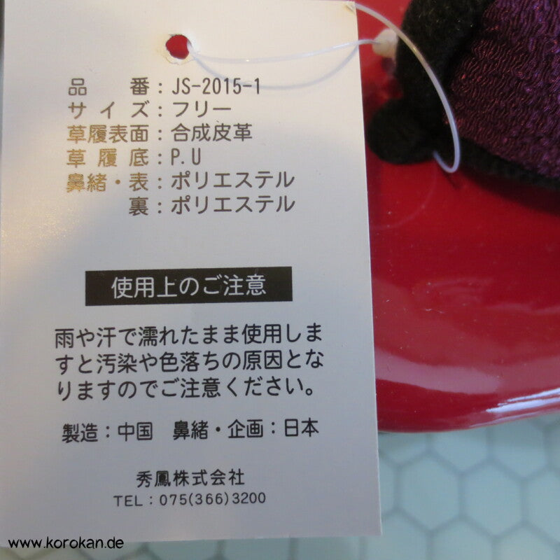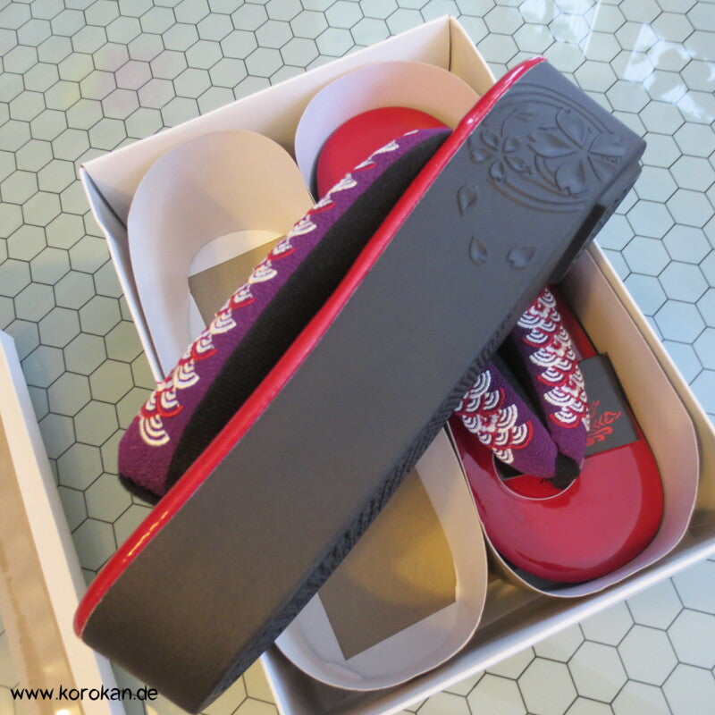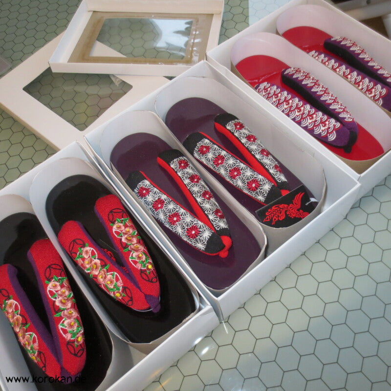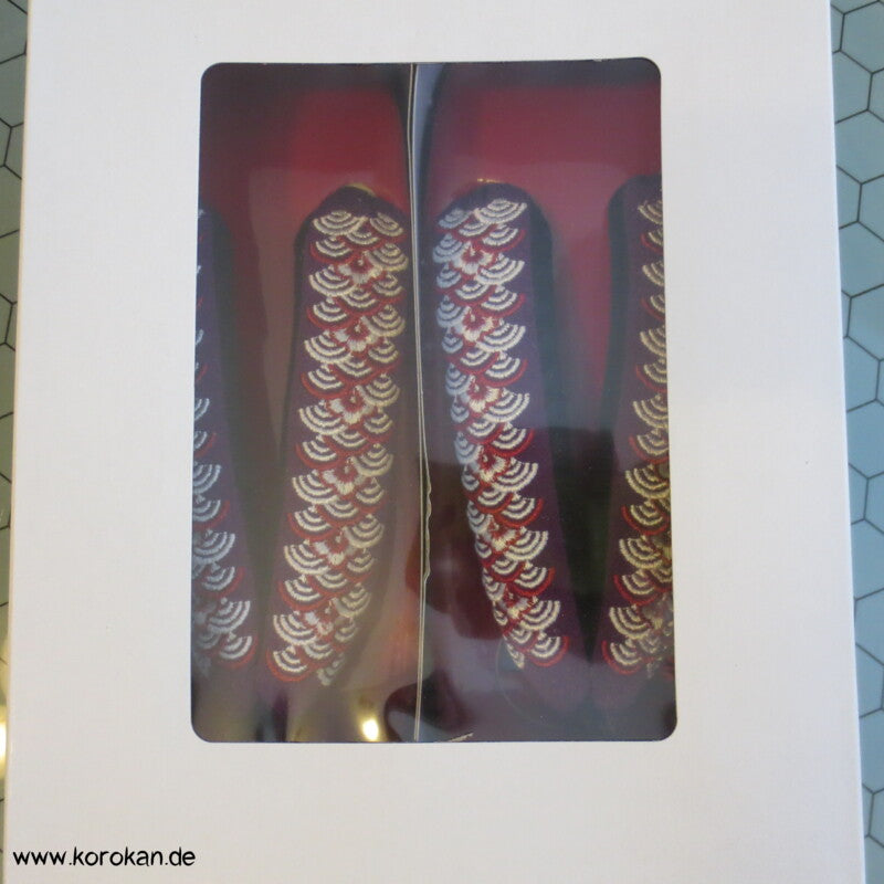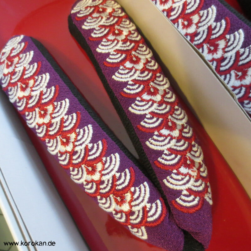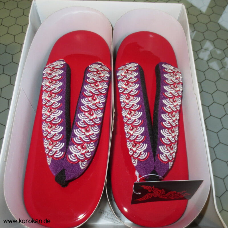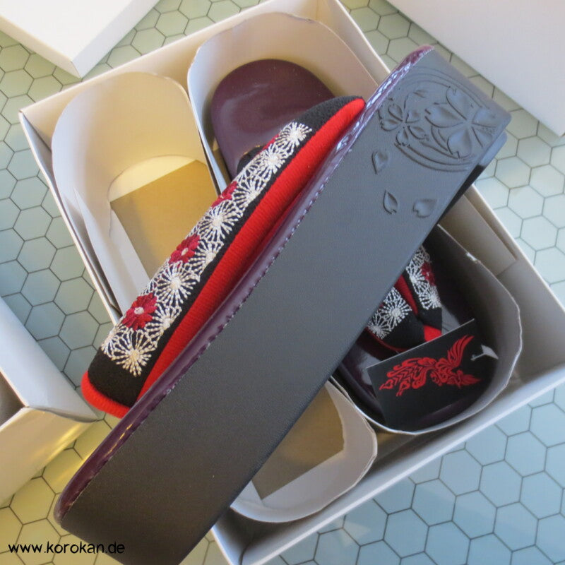 Vintage unbenutzte originalverpackte Zori - PU Sohle mit Sakura Druck, Lackleder Auflage und bestickte Riemen