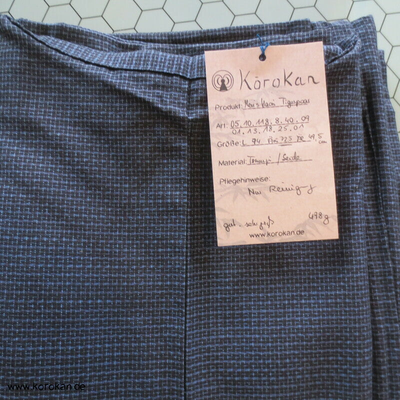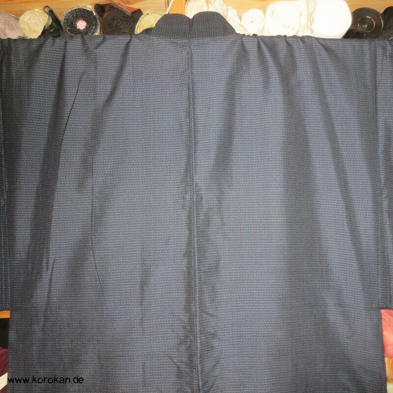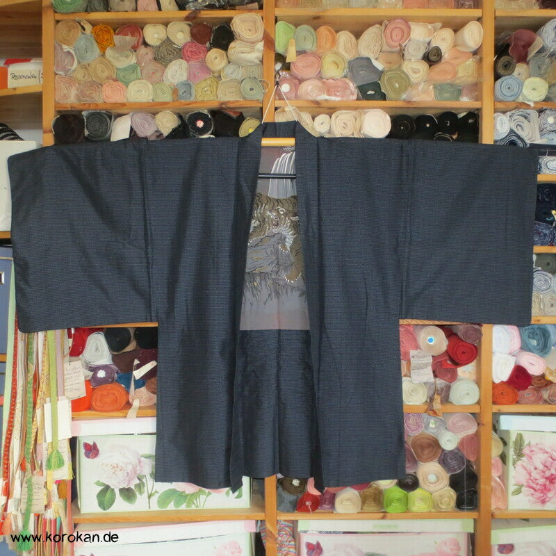 Vintage japanische Männer Haori aus schwarz bleu feiner Kasuri garngefärbter zart karierter Tsumugi Seide mit Seidenfutter zwei Tiger am Meer bei Nacht